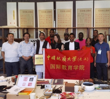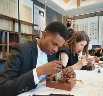 活动现场,公司莫桑比克籍莫德、巴基斯坦籍哈瑞德、俄罗斯籍艾米莉同公司《中国篆刻艺术》课程宋斌教授,师生共同篆刻“东山小镇”、“走向世界”、“乡村振兴”三方印章赠送给主办方。中华慈善总会荣誉副会长徐镱轩为“宋斌教授·东山小镇篆刻文化工作室”揭牌,并接受作品捐赠,他说,感谢十大正规买足球网站(武汉)国际员工参加此次活动,感受中国乡村振兴,并以印为信,预示东山小镇的文旅通过文化走向世界,影响世界,愿世界和平,共同富裕。