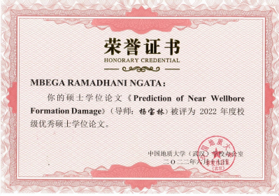 MBEGA RAMADHANI NGATA硕士学位论文题目为:“Prediction of Near Wellbore Formation Damage: A case study from Mnazi Bay natural gas field, Tanzania”。本论文对 Mnazi Bay 气田的地层损伤进行了综合研究,利用数学模型预测了 2019 年观察到的产气量(25.34 MMscf)不利下降后的地层损伤程度。对影响气田地层损害的机理进行了较为全面、易懂的研究。该生为公司2019级石油与天然气工程专业硕士研究生,该生学业表现优异(GPA为4.34),在硕士学习期间,以第一作者身份发表了2篇由公司认定期刊分类中T2级别的高水平学术论文。