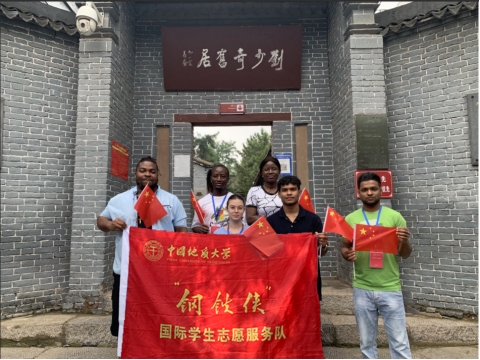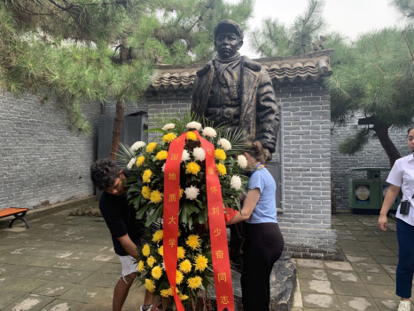 7月29日上午,“钢铁侠”志愿服务队社会实践团中外师生第三站“重访红色圣地·读懂今天中国”,来到河南省红色教育基地八路军渑池兵站纪念馆的刘少奇旧居,在讲解员的带领下,虔诚聆听了“党性考验”、“党性修养”、“党性展现”、“党性锻炼”四个展室的解说,重温了当年烽火岁月里刘少奇同志和其他兵站同志艰苦奋斗的工作场景。“钢铁侠”志愿服务队社会实践团给先烈敬献花篮、全体师生向刘少奇雕像鞠躬。东帝汶籍本科生帝诺说:“我在听讲解员讲到在豫西特委会议旧址中,那么小的房间30几个人学习《共产党的修养》,信仰的力量真的太伟大了。”