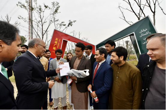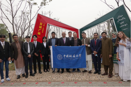 莫因•哈克大使(中)与公司师生代表在“中国-巴基斯坦友谊广场”雕塑前合影留念