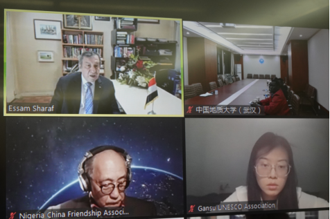 埃及前总理埃萨姆·谢拉夫先生线上致辞(图左上)