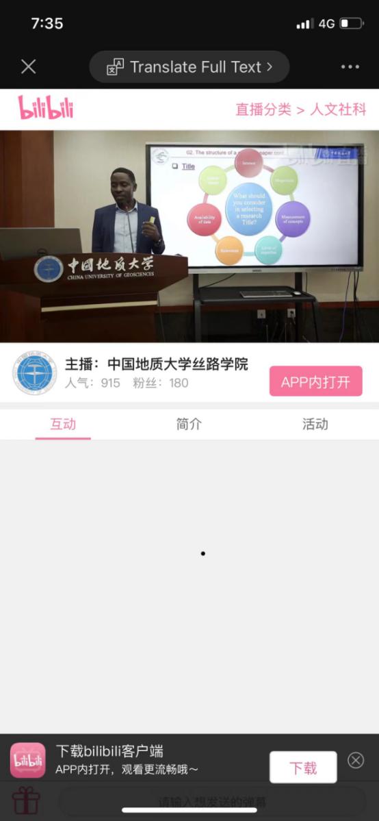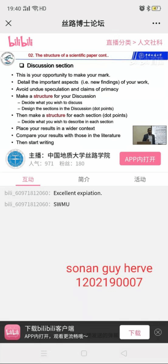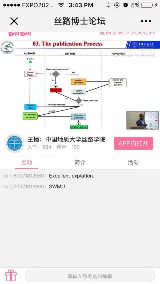(通讯员 赵阳平 摄影 贾力)12月15日,2021年第七期丝路博士论坛由坦桑尼亚籍资源公司博士研究生ALVIN KAJONGO MULASHANI (中文名:穆拉沙),喀麦隆籍康亦灵主持,穆拉沙以《 Easing Academic Paper Writing and Publication Process (My experience)》为主题做论坛,线下20余名硕博研究生在丝绸之路公司会议室参加讲座,近千人在境内外参加线上讲座。