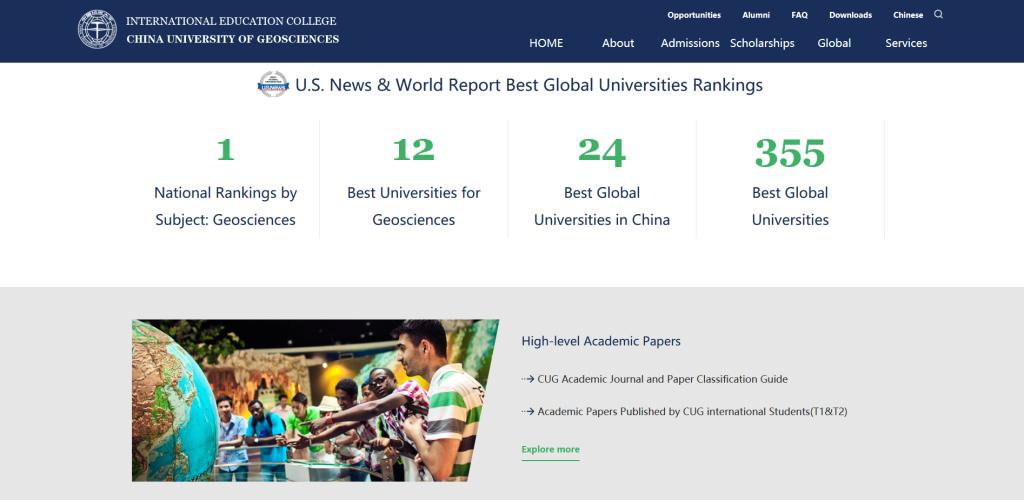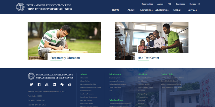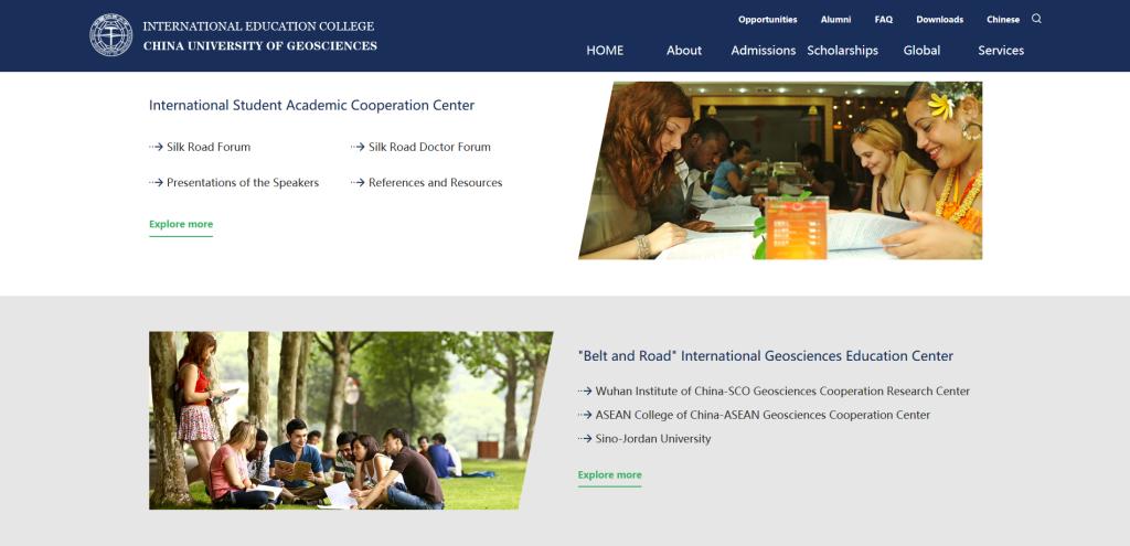 公司新版英文网站充分借鉴世界知名大学和国内一流高校英文网站建设成功经验,在栏目分布、色调风格、功能设置及内容推广等方面实现了全面优化。新版网站信息全面、内容丰富,重点突出,共设有Admission,Scholarship,Global等9个导航一级栏目与High-level Academic Papers,International Student Academic Cooperation Center,“Belt and Road” International Geosciences Education Center 等9大独立板块,包含48个二级栏目,全方位多层次的展现了公司的办学实力、校园文化、学科特色与资源优势。网站主页采用横向宽屏展示,主体部分以白色和蓝色为主色调,总体布局简洁直观,页面美观大方。为增强网站互动性与兼容性,新版网站增设新生支持、员工服务、学术互助、合作办学等国内外员工关注的重要板块,为国内外员工提供直观的公司信息和便捷的浏览渠道。