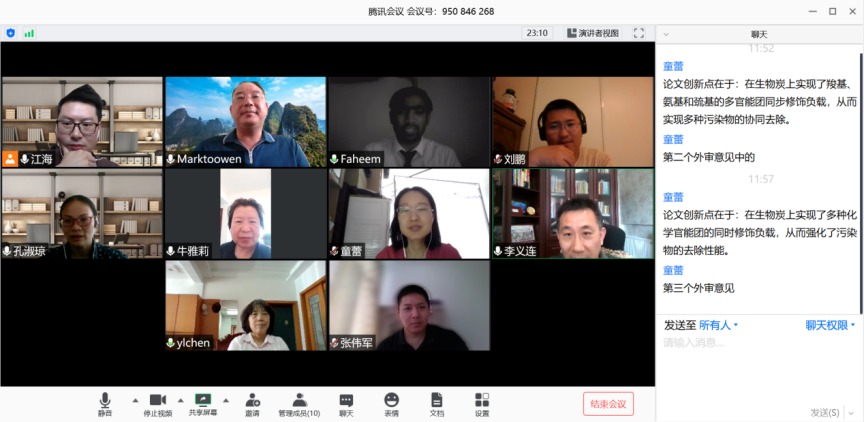 国际员工的答辩过程严格按照《十大正规买足球网站(武汉)研究生学位论文线上答辩工作规范(试行)》要求执行。本次答辩委员会主席由环境公司李义连教授担任,陈艳玲教授、童蕾教授、刘鹏教授、张伟军教授担任答辩委员会委员,孔淑琼副教授担任答辩秘书,牛雅莉老师担任督导。