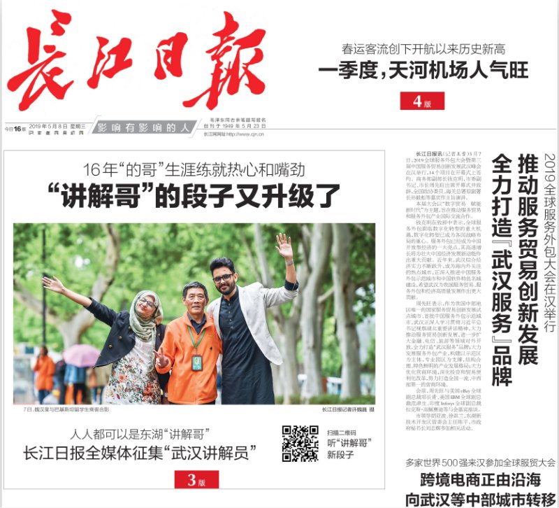 服务军运会——公司国际员工马尔汉、何帆听东湖网红讲解员魏师傅的讲解,长江日报全媒体向全市征集东湖讲解员。
