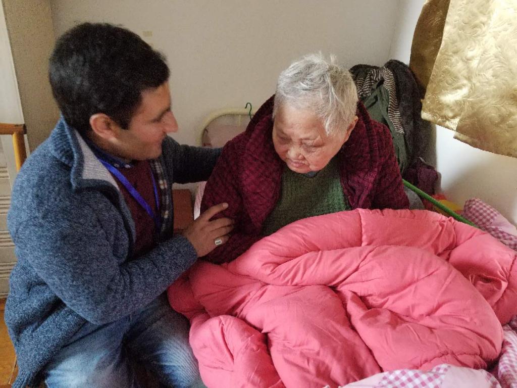 随后,志愿者们同康寿养老院内的老人们一同话家常,一位94岁高龄的老人拉着巴基斯坦籍易思迈的手,亲切地问到“在中国生活好不好”、“想家了没有”,他的热情令第一次来养老院的同学们瞬间平息了忐忑的心情。临别时,老人们慢慢地和志愿者们挥手告别,有位老爷爷抓着来自东帝汶的欧阳鸿飞的手激动地说“再来啊”,国际员工们也认真的说“一定会的,一定会的!”。