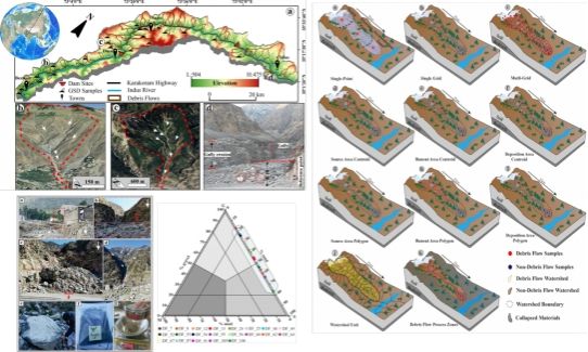 该研究聚焦中巴经济走廊(CPEC)和喀喇昆仑公路(KKH)所经的大喜马拉雅Besham-Chilas廊道,针对该区域滑坡、泥石流灾害频发、重大水电工程密集布局的复杂背景,团队创新构建了树模型机器学习与流变动力学耦合分析框架。通过126起典型泥石流事件的野外调查与21份沉积物粒度样品分析,系统揭示了当地以砾石为主、黏土含量极低的水石流物源特征。研究明确了GBDT模型在泥石流易发区识别中的优越性,借助SHAP算法厘清了致灾因子贡献排序,结合Flow-R模型实现了泥石流运动路径与风险等级的空间精准划分,为沿线重大基础设施选址优化与地质灾害防控提供了科学依据。