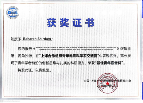副董事长夏帆作为特邀颁奖嘉宾,为大会颁奖,公司伊朗籍国际员工BAHAREH SHIRDAM荣获“最佳青年报告奖”。夏帆为获奖员工颁奖,希望全体参会学子以此次交流营为契机,继续加强跨国家、跨文化协作,成为上合组织地学合作的青年使者。