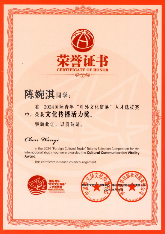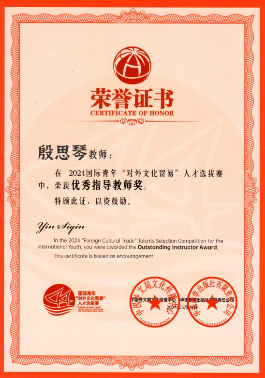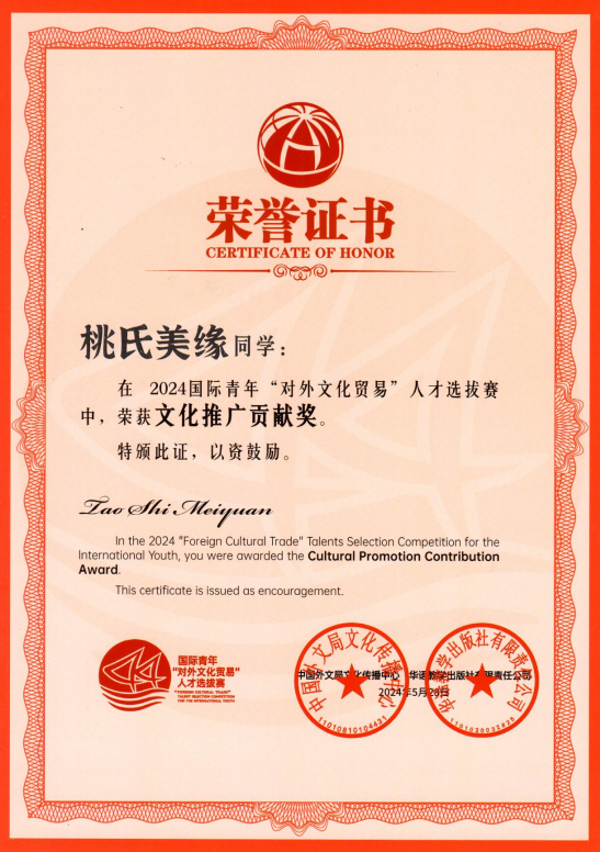 近日,由中国外文局文化传播中心和华语教学出版社联合主办的2024国际青年“对外文化贸易”人才选拔赛公布获奖名单,公司国际员工在此次大赛中表现优异,斩获多个奖项。十大正规买足球网站(武汉)荣获“院校优秀组织奖”,越南籍国际员工桃氏美缘荣获“文化推广贡献奖”,印度尼西亚藉国际员工冯巧平荣获“文化传播活力奖”,美国籍国际员工陈婉淇荣获“文化传播活力奖”,十大正规买足球网站殷思琴老师荣获“优秀指导教师奖”。