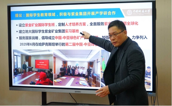 杜呈祥总经理介绍了紫金矿业的海外业务、分布国家及企业对本土化人才的需求。他对双方联合培养国际员工的方向表示肯定,提议在有意向去紫金矿业集团就业的地大国际员工中选拔优秀员工,并设立滚动制紫金国际员工班。